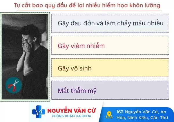 Không riêng gì trường hợp của anh Đ mà còn rất nhiều cánh mày râu khác cũng vì chủ quan mà thực hiện hành động như trên. Theo các chuyên gia Phòng Khám Đa Khoa Nguyễn Văn Cừ, nam giới không nên tự cắt bao quy đầu tại nhà, vì chính điều này có thể gây ra nhiều hậu quả như:
