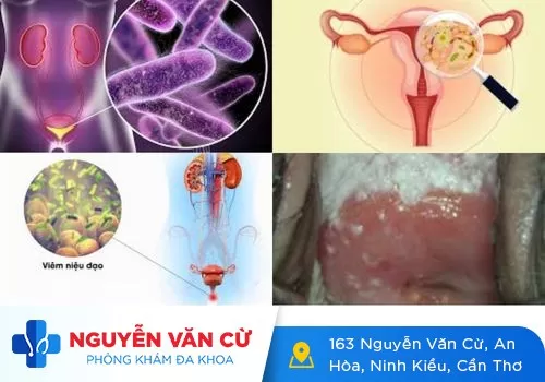 – Nhiễm khuẩn âm đạo: Xảy ra do những vi khuẩn có hại (như nấm men, Trichomonas,…) trong âm đạo phát triển quá mức. Bệnh được đặc trưng bởi tình trạng khí hư bất thường, ngứa ngáy vùng kín, quan hệ đau rát kèm tiểu buốt, tiểu ra máu,…