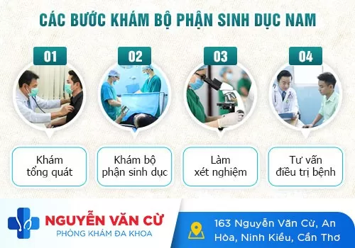 – Khám bộ phận sinh dục để phát hiện các bất thường như: viêm bao quy đầu, hẹp bao quy đầu, cong dương vật, giãn tĩnh mạch thừng tinh…