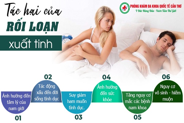 – Ảnh hưởng tới sức khỏe sinh sản, rối loạn xuất tinh trong thời gian dài dẫn đến số lượng, chất lượng tinh trùng giảm, ảnh hưởng đến khả năng sinh sản. Dương vật chưa tiếp xúc với âm đạo đã xuất tinh hoặc không thể xuất tinh thì khả năng thụ thai sẽ rất thấp, tinh trùng khó có thể gặp trứng để thụ tinh. Nếu để bệnh lâu dài sẽ biến chứng dẫn tới vô sinh, gây rối loạn cương dương, không làm chủ được khả năng cương cứng, mất cảm giác thích thú khi dương vật bị kích thích