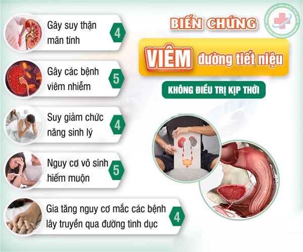 Nếu để lâu, trạng viêm nhiễm tại đường tiết niệu còn có thể lây lan sang các vị trí lân cận, gây viêm tinh hoàn – mào tinh hoàn, viêm ống dẫn tinh… đồng thời tăng nguy cơ mắc phải các bệnh lây truyền qua đường tình dục như sùi mào gà, lậu… ảnh hưởng nghiêm trọng tới sức khỏe và khả năng sinh sản, thậm chí còn nguy hiểm tới cả tính mạng.