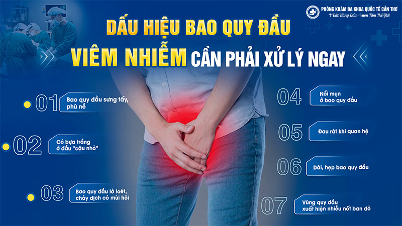 – Phần đầu dương vật bị sưng tấy, lớp da bao quy đầu tấy đỏ.